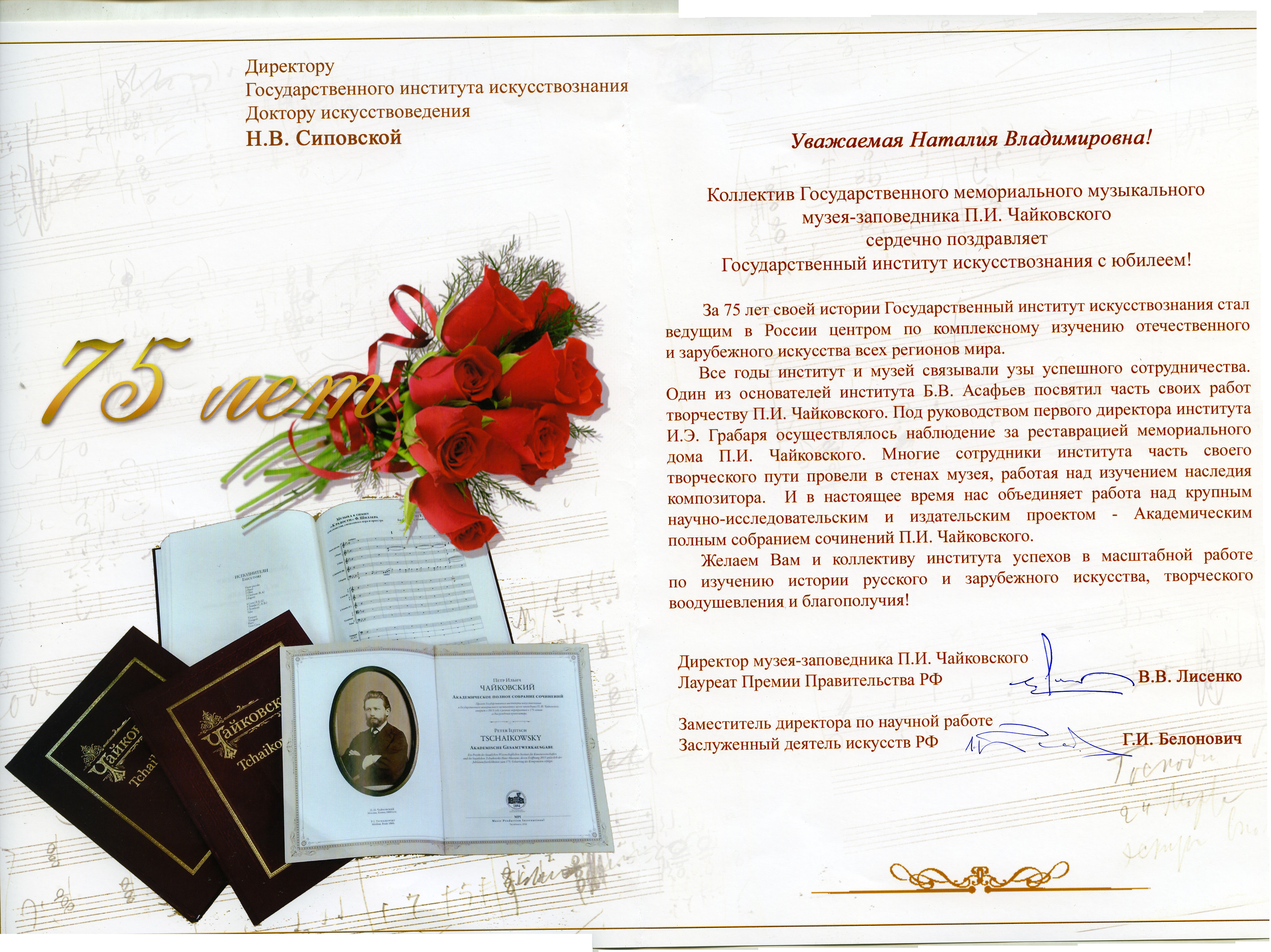 Поздравление Государственного мемориального музыкального музея-заповедника П.И. Чайковского