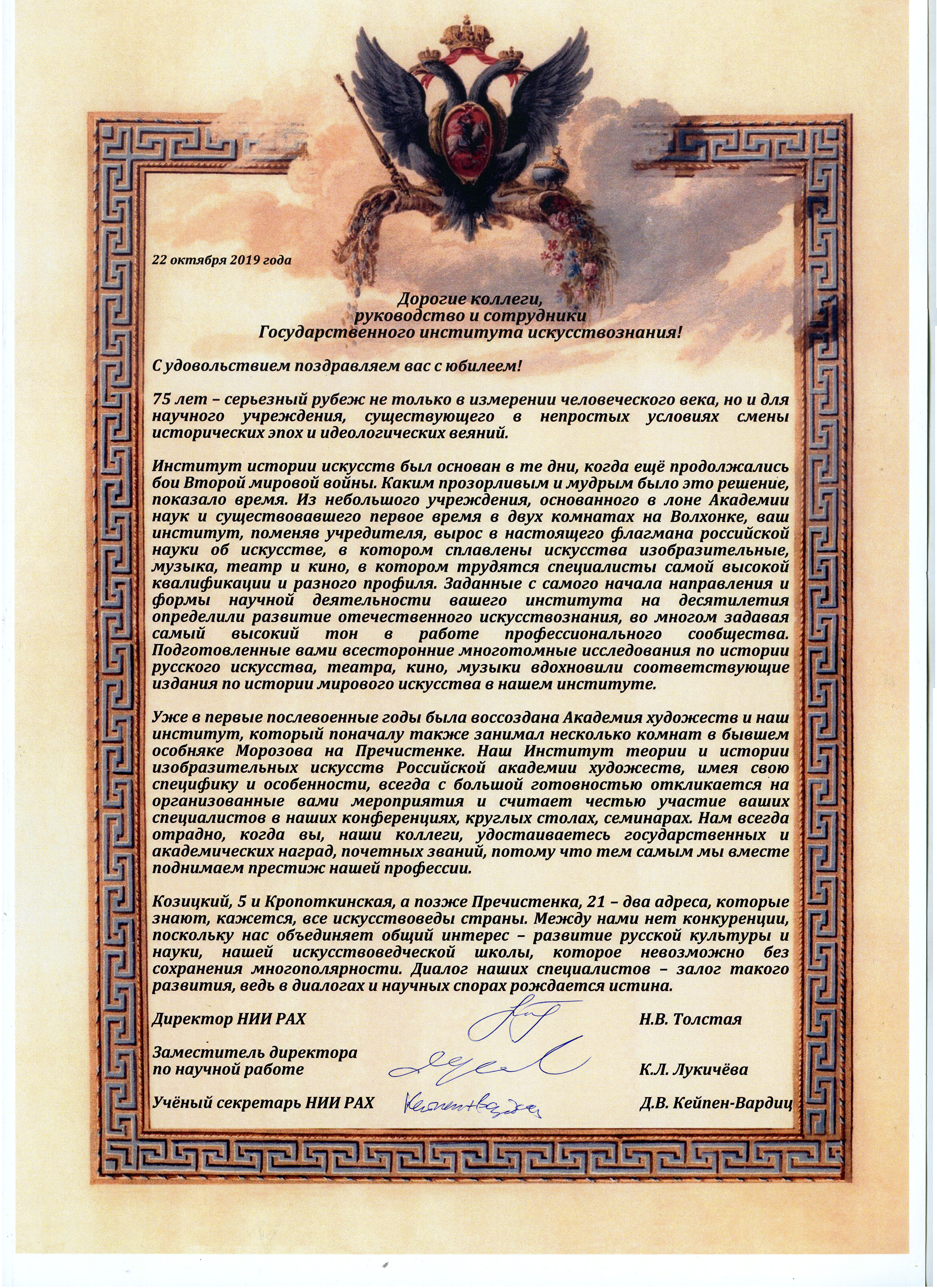 Поздравление НИИ теории и истории изобразительных искусств РАХ